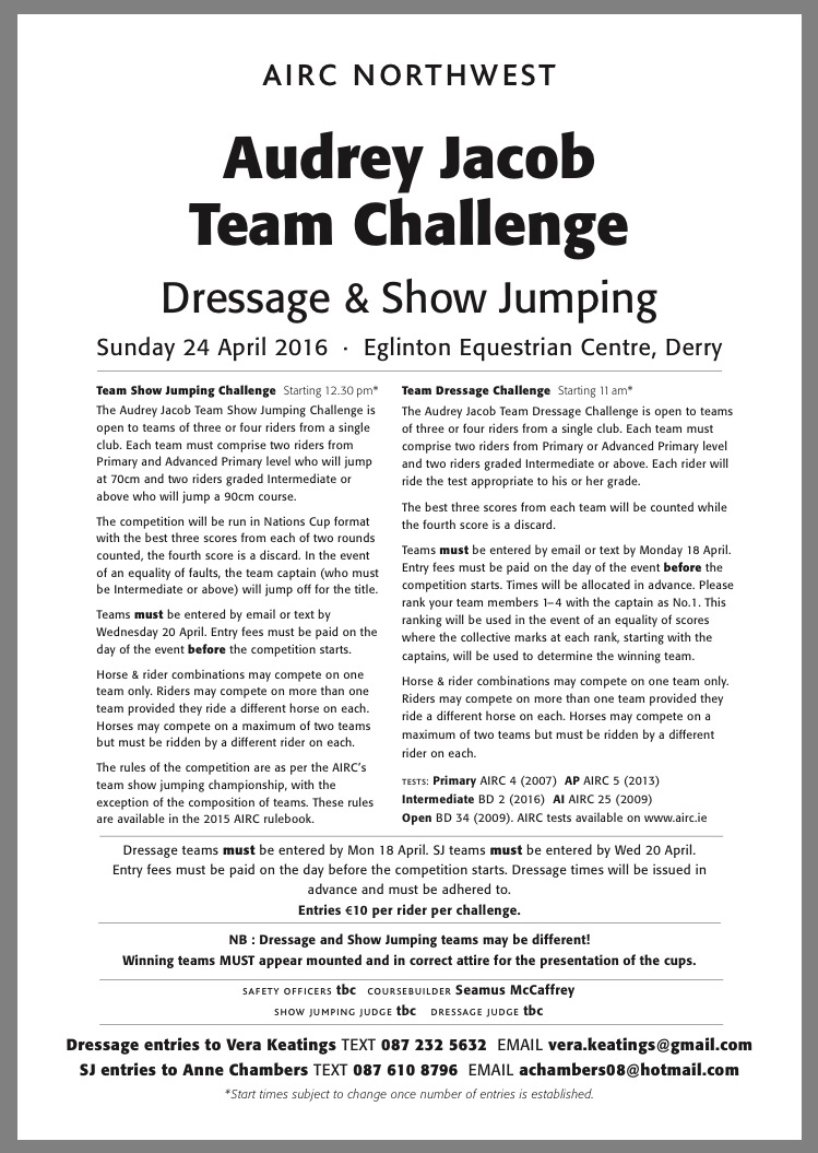 April 11, 2016 Inishowen Riding Club Audrey Jacobs Team Challenge Anyone interesting in taking part in either Dressage, Showjumping or both, please put your name forward for teams to Erica (secretary) before next Monday 18th. Share this: Click to share on X (Opens in new window) X Click to share on Facebook (Opens in new window) Facebook Like Loading... Related