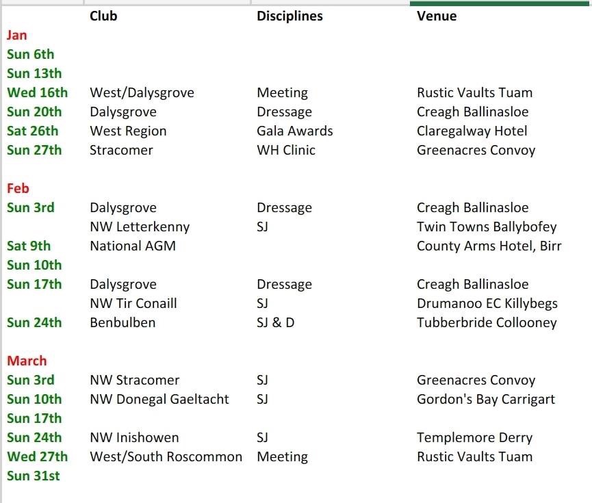 January 19, 2019 Inishowen Riding Club 2019 West Region Calendar Lots of upcoming events for the next few months; Share this: Click to share on X (Opens in new window) X Click to share on Facebook (Opens in new window) Facebook Like Loading... Related